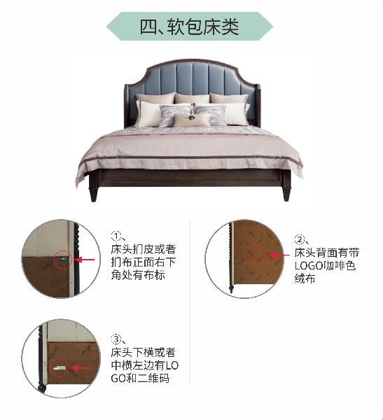 (1)床头扪皮或者扪布正面右下角处有布标;